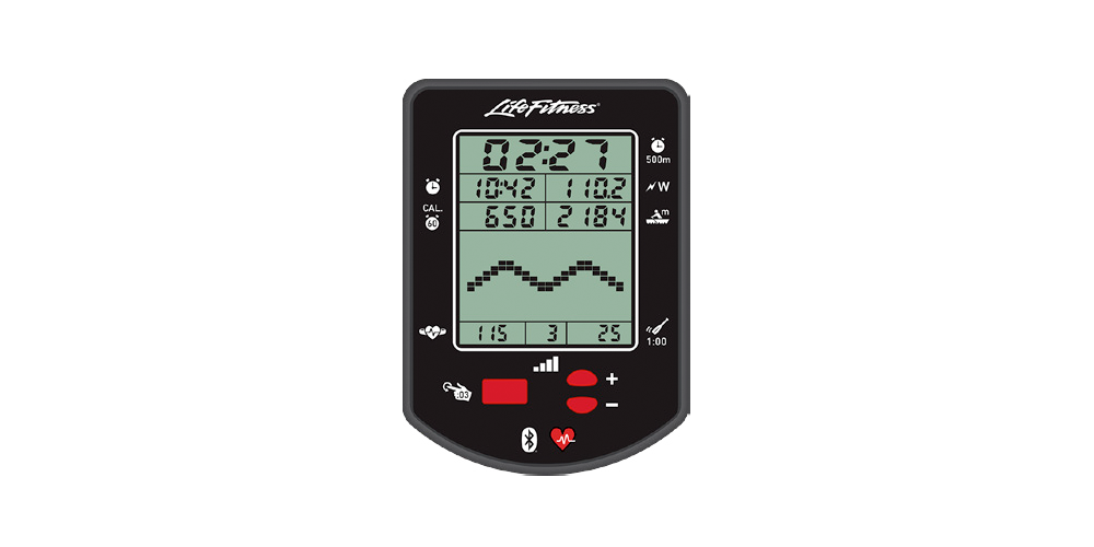 Die BT-Konsole zeigt folgende Trainingsmetriken an: Zeit, Stufe, Distanz, Schläge pro Minute, 500-Meter-Splittzeit, Kalorien/Stunde, Watt und Herzfrequenz (kompatibler Herzfrequenzmesser erforderlich).